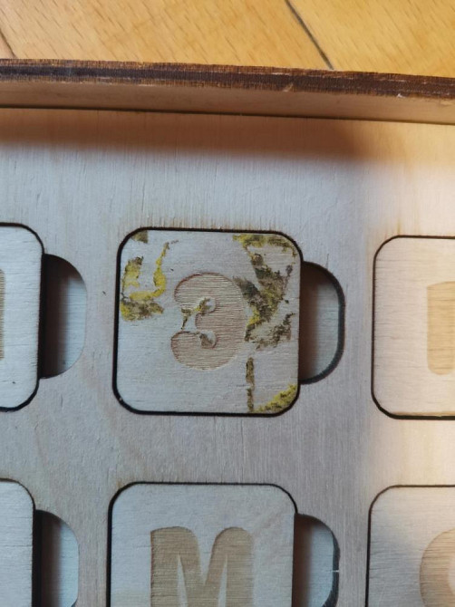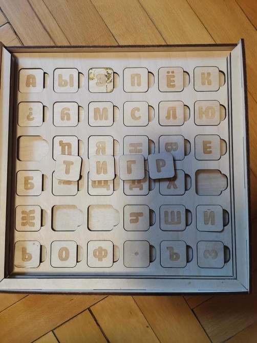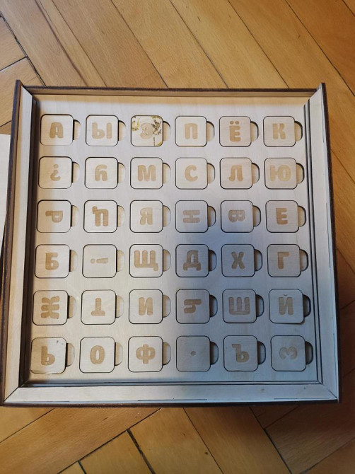 Новый, буквы вынимаются и вставляются в рамки, можно составлять слова, две буквы с браком(видно на фото). В профиле много товаров для детей.