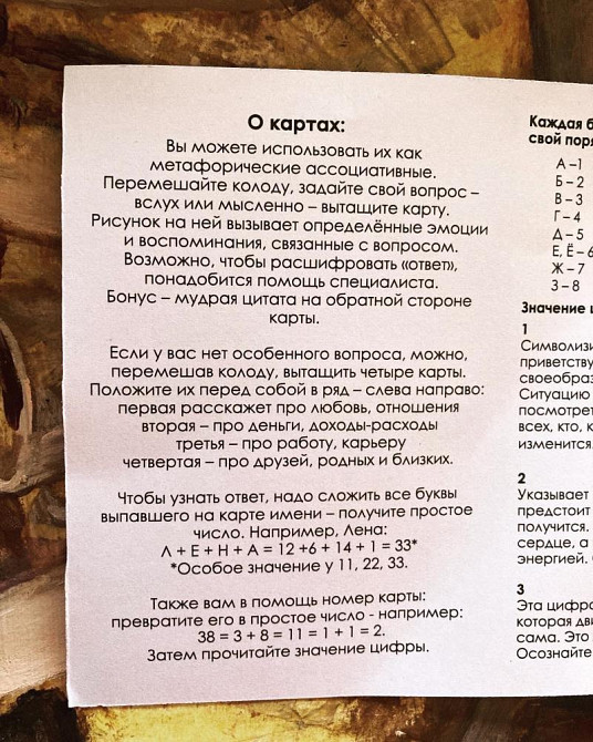 На оборотной стороне каждой карты – мудрая мысль. Можно гадать - с подругами, вытаскивая из колоды «фразу дня».