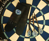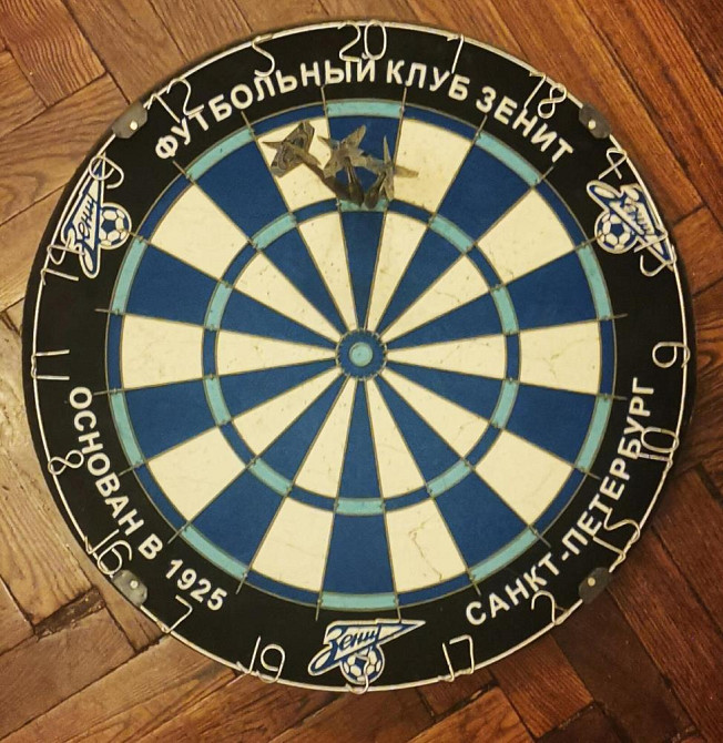 Набор для игры в дартс ФК Зенит. Покупался в официальном магазине примерно в 2009 году. За это время почти не использовался, висел как декор. Трещенки на мишени это такой материал, так было с самого начала. Отличный подарок болельщику или коллекционеру. Их осталось на вторичном рынке "живых" мало. В комплекте два набора по три штуки дротиков в чехлах, крепление на стену. Дартс толстый, примерно 4 сантиметра.