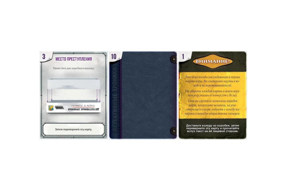 Колода карт расследования кладётся в центре игрового стола. Карты в колоде нельзя перемешивать и подсматривать, игра начинается с верхней карты. Прочитайте текст на первой карте. В начале игры участники соберут из коробки объёмное место преступления, а далее игра сама расскажет вам, что делать дальше, и в какой последовательности.
