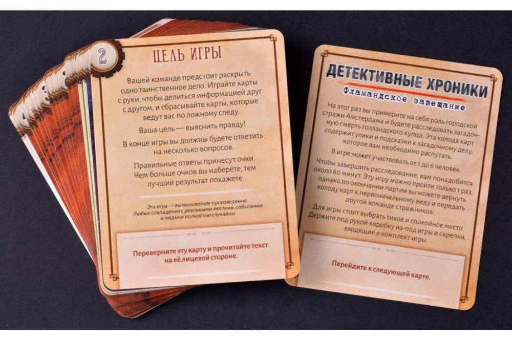 «Детективные хроники: Фламандское завещание» - это кооперативная игра, расследование, в котором вам сообща предстоит раскрыть дело. Соберите из коробочки и карт место преступление и погрузитесь в расследование. Изучайте улики и выдвигайте свои версии. А те карты с уликами, которые, по вашему мнению, не принесут пользы, сбрасывайте. А если вы уверены в своих силах и считаете себя вторым Шерлоком Холмсом, то можете попробовать раскрыть это дело в одиночку.