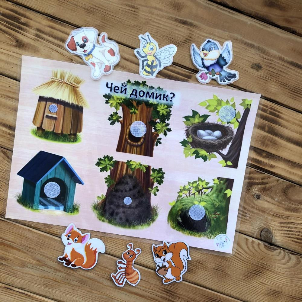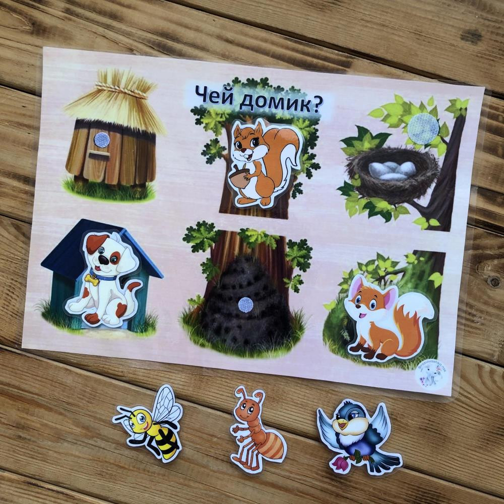Игра научит малышей определять, кто в каком домике живёт, сравнивать домики, а так же группировать животных на диких и домашних. Подходит для детей от 2 лет.