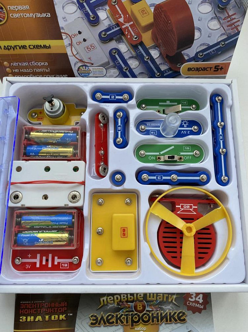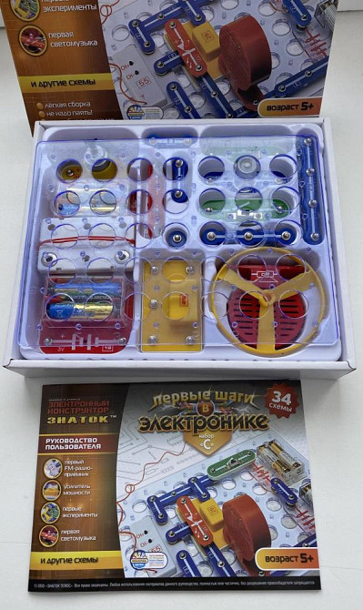 Продаю новый электронный конструктор Знаток, всего 34 разных схем, наглядно показывающих принципы работы простейших электронных устройств. Абсолютная безопасность и простота сборки – не надо паять! В комплектацию данного набора входит «Руководство пользователя» и детали, необходимые для выполнения предложенных в руководстве проектов. Отличный подарок!