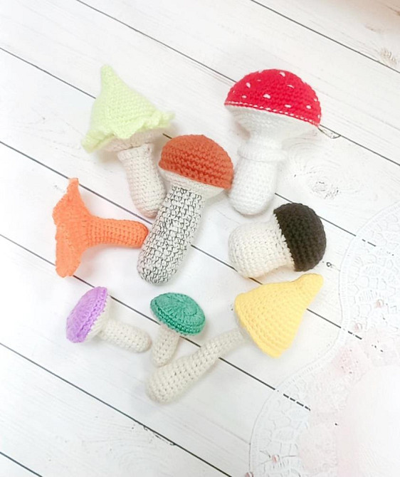 Игровой набор вязаные грибы. В набор входят: мухомор, 2поганки, 2сыроежки, лисичка, подосиновик, белый гриб. *8грибочков*