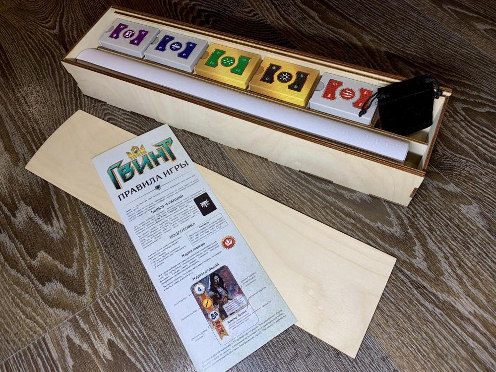 Полный комплект: пять колод в картонной упаковке, в том числе колода Скеллиге, поле из баннерной ткани, карты в приятной матовой ламинации, фишки, кристаллы и руководство