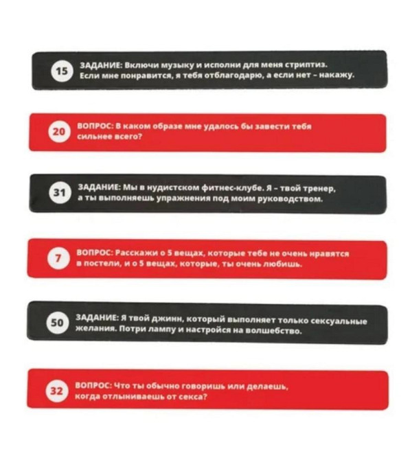 Это секс-игра для двоих, которая воздействует на самую мощную эрогенную зону человека - его мозг и воображение. В процессе игры партнеры получают возможность поделиться друг с другом своими фантазиями, преодолеть барьеры и достичь более высокого уровня доверия. В комплект входят: подарочная упаковка, инструкция и 50 карточек. На каждой карточке с одной стороны вопрос, а с другой - задание. Всего 100 оригинальных вопросов и заданий. "Секс Челлендж" позволяет партнерам раскрепоститься на ранних этапах отношений, когда вы еще только узнаете друг друга. Игра также помогает оживить брак или многолетние отношения и придать им чувственной остроты.