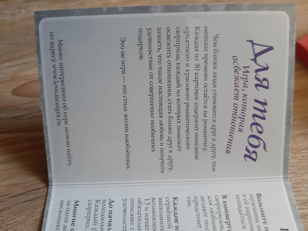 "Каждая из 30 карточек содержит описание приятного и красивого романтическоо сюрприза, каждый из которых поможет освежить отношения, стать ближе к друг другу, понять, что такое любовь и получить удовольствие от совершенно новых подарков."