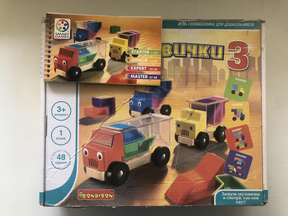 Развивающая игра-головоломка, производитель бондибон, грузовички в очень хорошем состоянии, коробка потрёпанная (сын предпочитал больше играть коробкой)