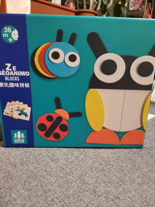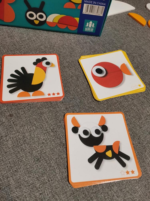 Бу, очень интересная игра, состояние отличное, материал дерево. Три уровня сложности, смысл:по примеру собрать зверька, можно изучать цвета (по деталям) или определять размер (большая или маленькая деталь) , делить на группы по цветам.Неограниченное поле фантазии для взрослых и детей:можно придумывать собственные варианты. В профиле много товаров для детей.