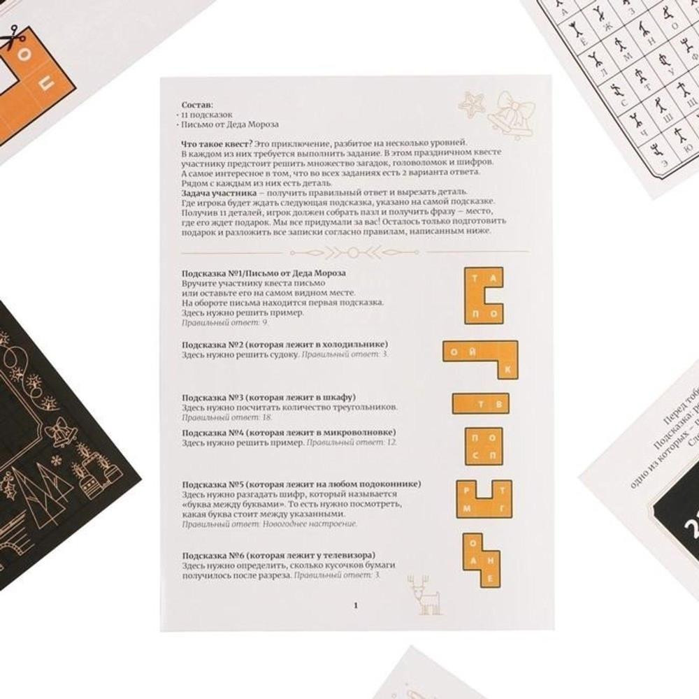 Игра-квест гарантированно понравится как детям, так и взрослым, поскольку найти подарки, пройдя удивительное приключение, намного интереснее, чем просто обнаружить их под елкой. Ваша задача внимательно изучить инструкцию и разложить все подсказки. Игра начинается!