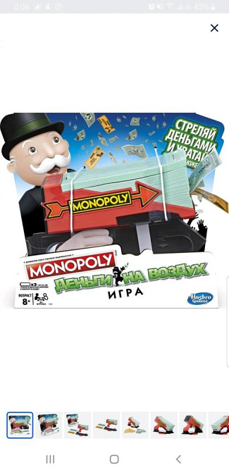 Отличная игра для компании. Не скучно и весело. Денежный бластер на батарейках, карты шанс, инструкция, банкноты. Б/у. Нет коробки