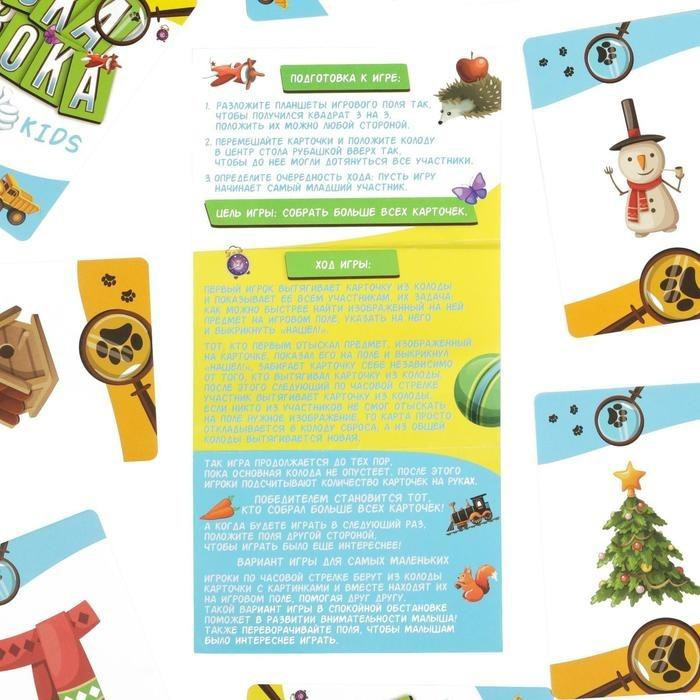 Перед вами настольная игра для детей от 2,5 до 6 лет, которая поможет развить внимательность. Вместе с малышом вытягивайте карточки и быстро ищите предметы на игровом поле!