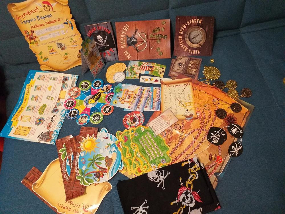 Компас и подзорная труба в комплекте. Растяжка, карта клада, игровые карточки, повязки на глаза, медальоны.