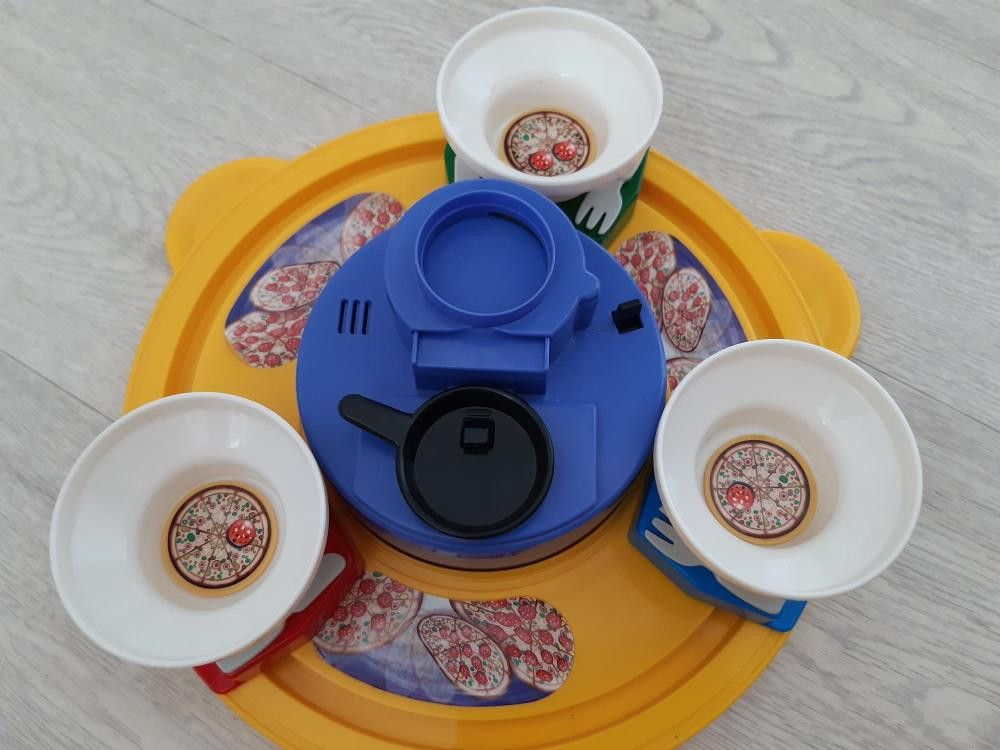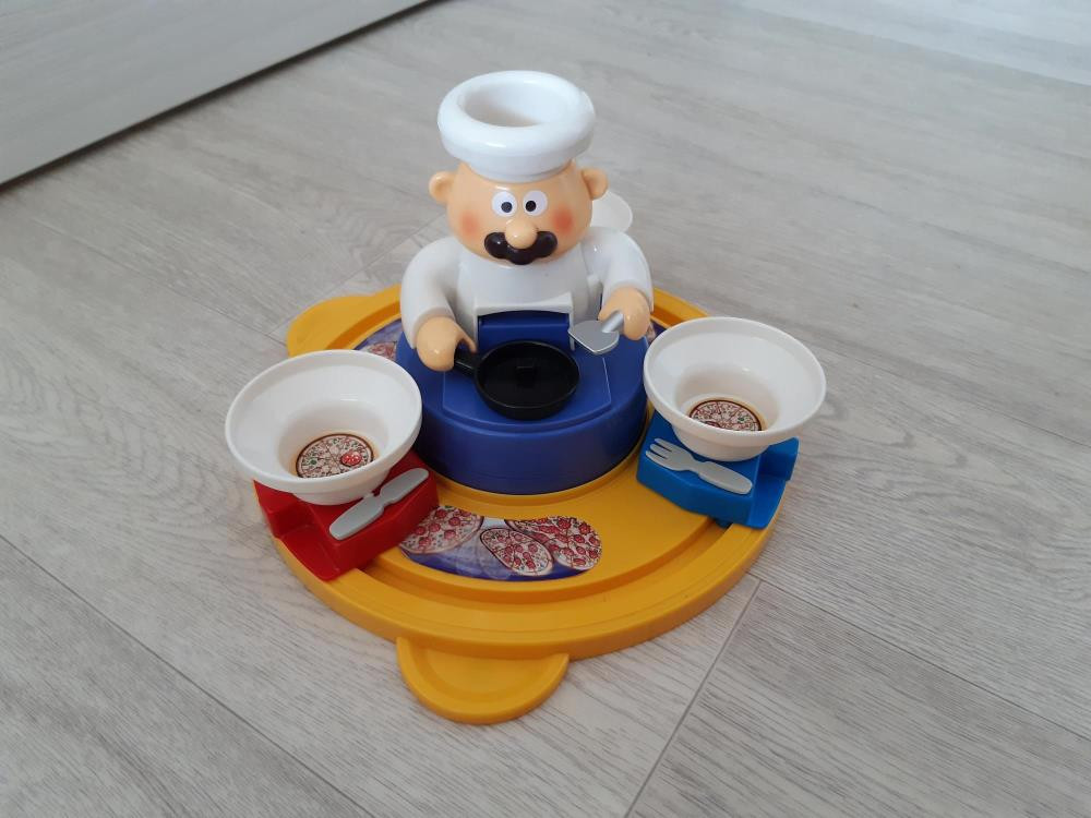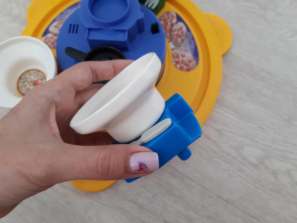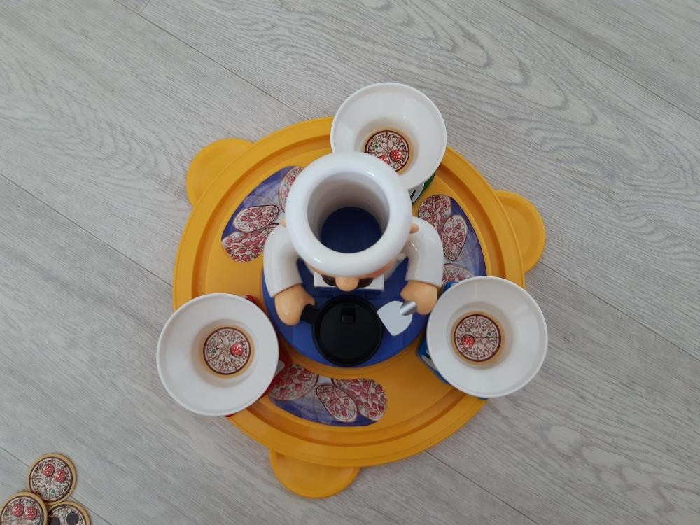 Сама игра в отличном состоянии, работает, батарейки в комплекте. Помята коробка и нет 4 фишек - пицц.