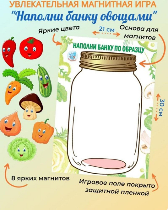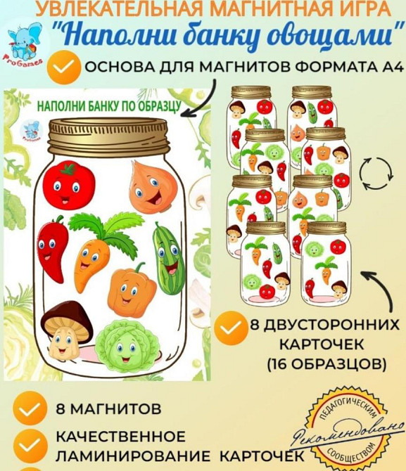 Продам новые развивающие магнитные игры. Наполни банку по образцу. В комплекте идут овощи, карточки и магнитная банка. В наличии 2 штуки.