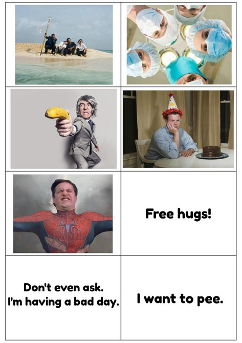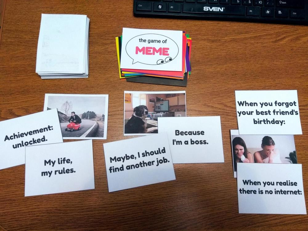 "The game of meme" - та самая игра. PDF файл для самостоятельной распечатки, в наборе 71 карточка с картинками и 104 карточки с надписями. Создана мною самостоятельно, вдохновилась играми Picwits, Caption it, What do you meme? и т.п. Правила есть в интернете или можно придумать свои варианты. Используйте для изучения/практики английского языка и просто just for fun на уроках и в компании. Уровень А2 и выше. Контент приемлемый для детей.
