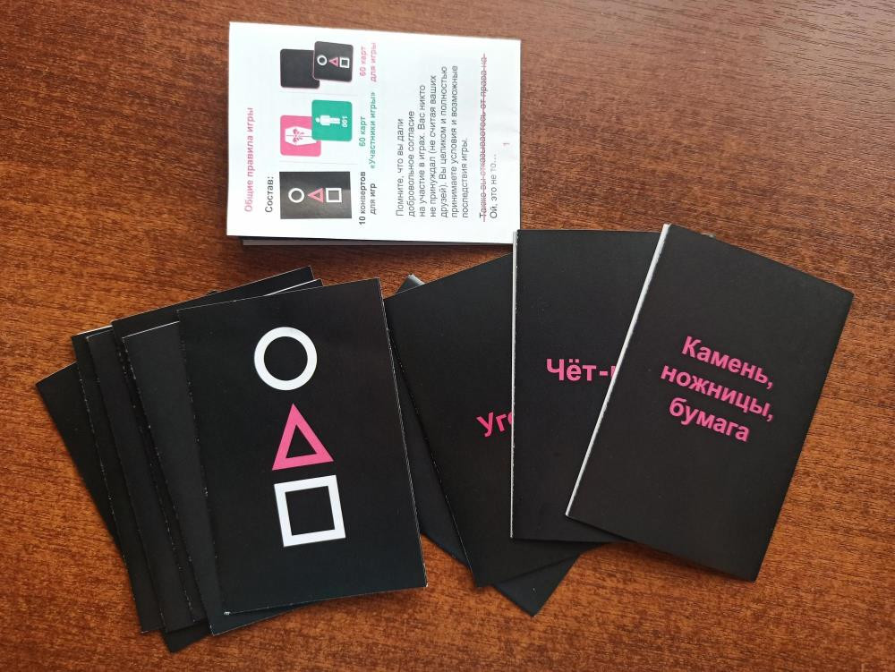 Игра в кальмара содержит 10 игр. Новая. Инструкция и карточки находятся в жестяной банке.