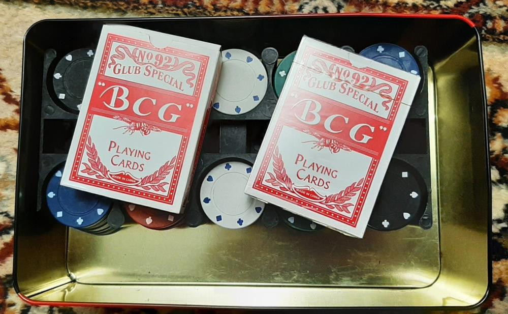 Когда-то была куплена, лежит без дела. Одна колода карт даже не вскрыта. Торг.