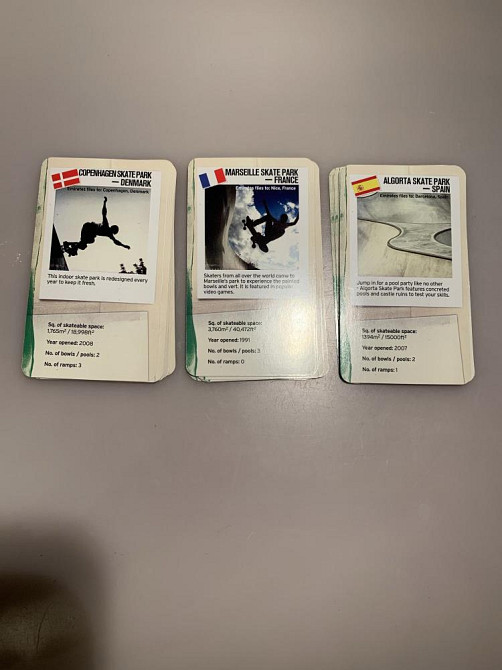 Дилер тасует, ?nd затем раздает все карты игрокам. Игрок слева от дилера начинает, выбирая категорию из карты - это может быть размер скейт-парка, количество чаш или пандусов. Двигаясь против часовой стрелки, следующий игрок читает такое же значение на своей карте. Наибольшее значение выигрывает руку и берет карты своих оппонентов, помещая их в нижней части их стопки. Тогда они получают, чтобы начать снова.