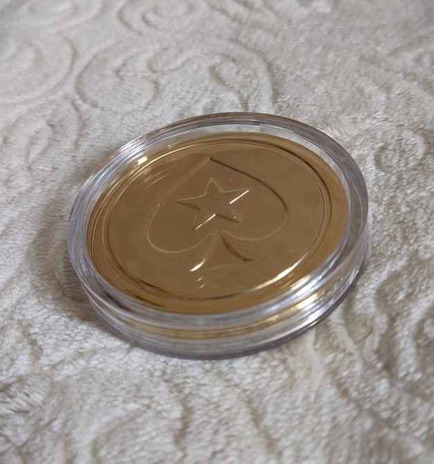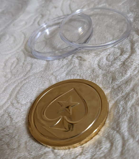 Очень редкий фирменный протектор карт StarsCoin от PokerStars из латуни в футляре. Вес 76 грамм. Диаметр 5.5 см.