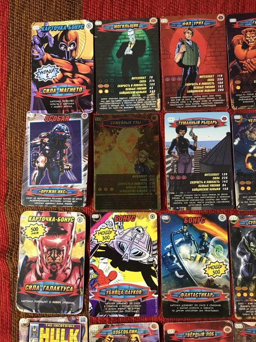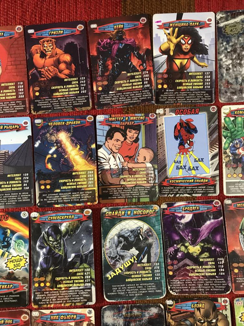 Разные карточки Человек Паук «Герои и злодеи». Для коллекции, ностальгии или ещё какого-нибудь творчества. Внешнее состояние на фотографиях постарался передать. Всего 32 штуки, и ещё 2 карточки Черепашки Ниндзя бонусом к ним.