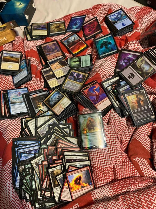 Есть карточки разной редкойсти, фойловые и обычные. В комплекте с ними отдаю протекторы и 2 бокса