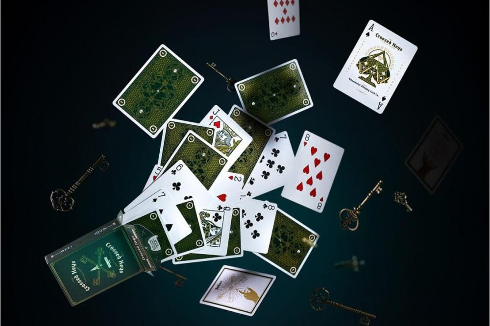 Crossed Keys — знаменитая метафора, обозначающая ключи к вратам Рая. Перевернутые ключи, в свою очередь, являются воплощением врат в ад. Перенести дуализм и мрачный символизм христанского символа в карточном виде взялась студия Ellusionist. Изумрудный зеленый цвет отлично гармонирует с белым оформлением классических карт. Золотые чернила изящно украшают картинку, а бумага и покрытие сделали карты долговечными и стойкими к любым воздействиям. Отличное дополнение к коллекции любого карточного фокусника.