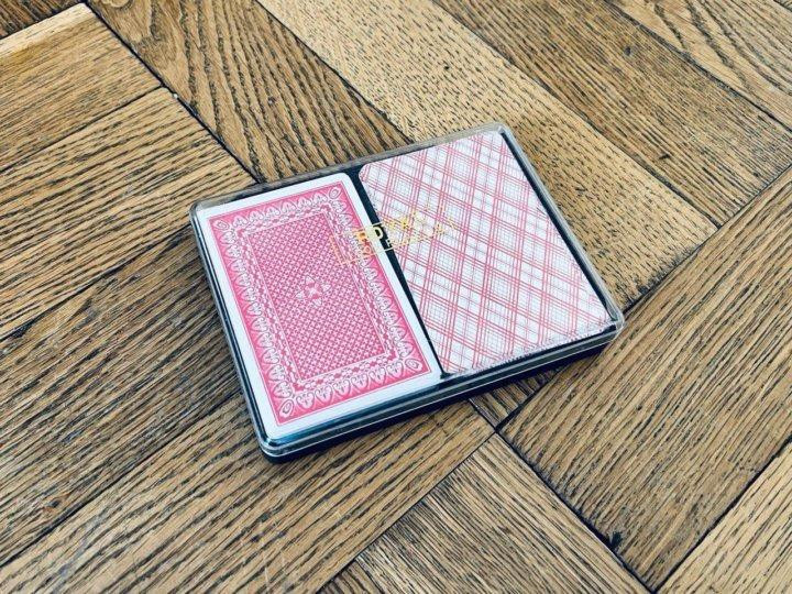 Продаю игральные карты, 2 колоды, в кейсе. Карты б/у мало, на самом кейсе есть потертости и небольшая трещина, что не влияет на функциональность. В хорошем состоянии.