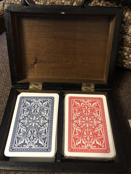Карты игральные в отличном состоянии в коробке из рифленой натуральной кожи, две колоды по 54 карты плюс запасные