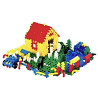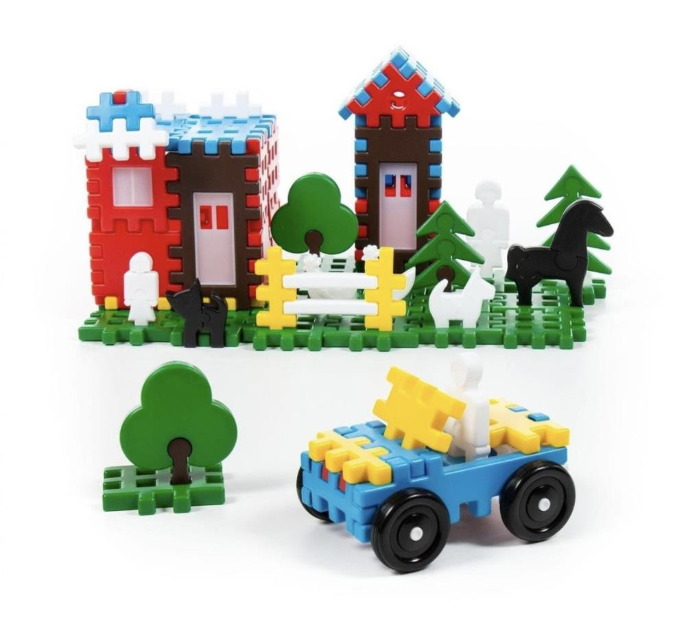 В комплект также входят фигурки людей, животных и деревьев, которые собираются по принципу пазла, и колёсики. Из них малыш сможет собрать машинку и построить большой красочный дом, населить его жителями, засадить участок деревьями и огородить забором. Ролевые игры с конструктором развивают детское воображение, логику, моторику рук и интеллект.
