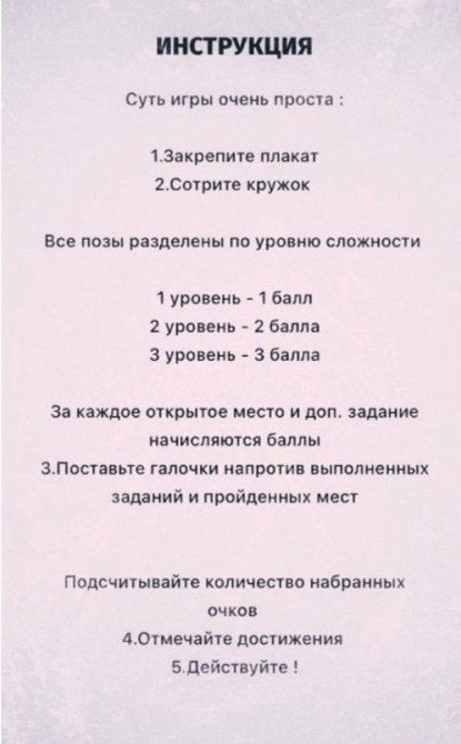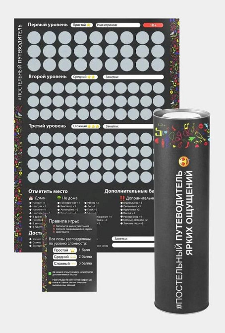 В комплекте: плакат с Камасутрой (позы закрыты скретч слоем), удобный и стильный тубус для хранения, инструкция и яркие ощущения