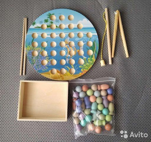 Увлекательная магнитная рыбалка для самых маленьких из натурального дерева. В маленьких отверстиях помещаются рыбки с магнитами и простые разноцветные шарики – морские камешки, которые нужно поймать юному рыболову. Для рыбок нужно использовать магнитную удочку, а для «ловли» разноцветных шариков палочки или пинцет, именно разнообразие инструментов для ловли не позволит малышу заскучать с данной игрой и отлично развивает ловкость, координацию и мелкую моторику. Мягкая цветовая гамма познакомит малыша с разнообразием цветов. В комплекте: удочка, пинцет, палочки, игровое поле, рыбки.