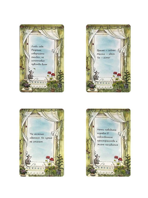 Можно работать с картинками и афоризмами отдельно, а можно вместе. Обе части колоды интересно сочетаются с другими колодами разных авторов.