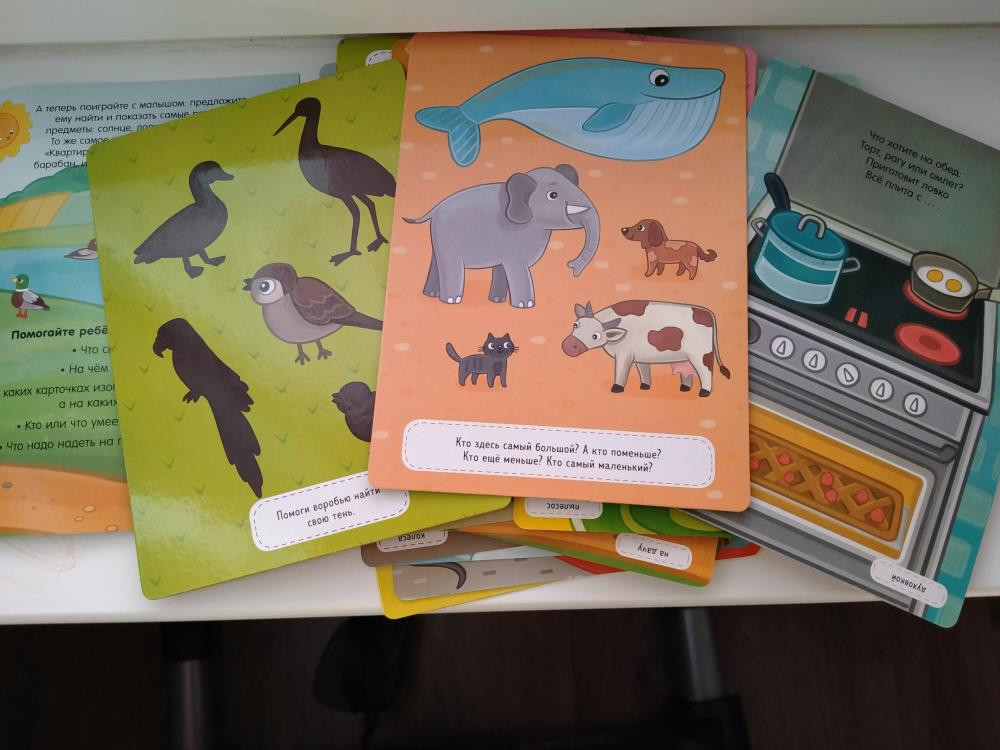 В яркой коробке 20 плотных двухсторонних карточек с заданиями (толщиной 1мм) + буклет-гид для родителей.