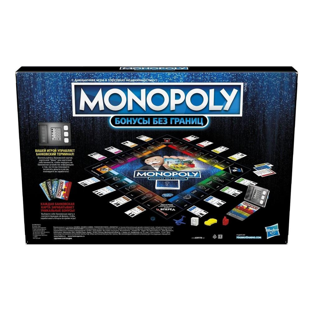В настольной игре “Монополия: Бонусы без границ” у каждого игрока есть банковская карта, которая приносит ему различные награды. Игроки могут перелетать к любой собственности на поле и вынуждать других игроков продавать свои владения. В этой версии “Монополии” нет бумажных денег - только банковские карточки и терминалы. Покупайте недвижимость, собирайте арендную плату и получайте вознаграждение! Выиграет тот, кто заработает самое большое количество бонусов!