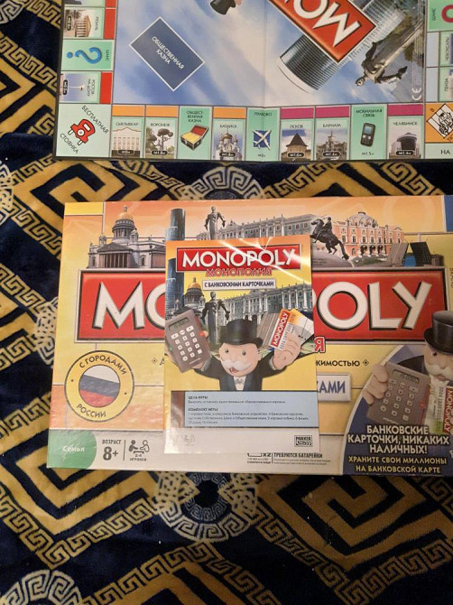 Монополия оригинал, покупали в детском мире, играли пару раз, в отличном состоянии, только при переезде коробка немного потрепалась. Монополия с городами России, в банкомате рабочие батарейки, полный комплект
