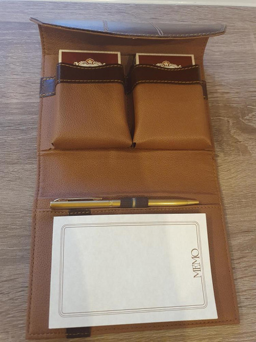 Набор из 2 колод карт, ручки и блокнота в кожаном чехле, в фирменной коробке, от итальянского бренда. Абсолютно новый, карты запечатаны.