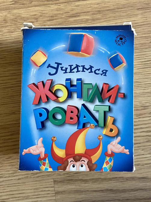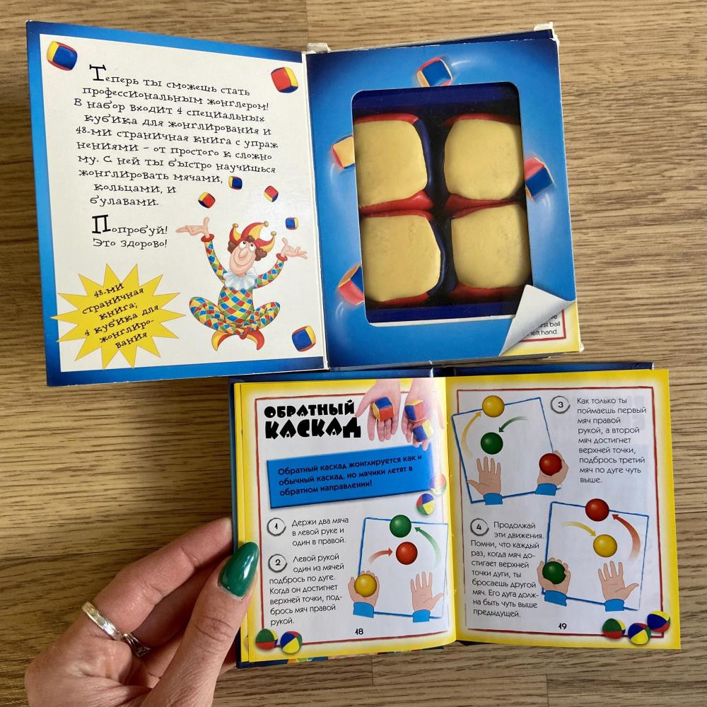 Набор состоит из 48-страничной книги с цветными иллюстрациями и упражнениями - от простого к сложному, и четырех специальных кубиков для жонглирования.