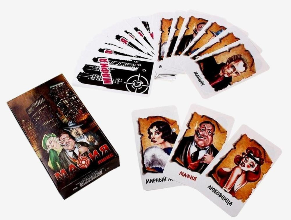 - Карты для игры в Мафию: Мирные жители - 12 шт Мафия - 3 шт Комиссар - 1 шт Ведущий - 1 шт Любовница - 1 шт, Врач - 1 шт, Маньяк - 1 шт.