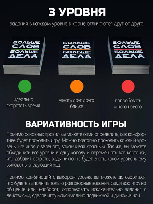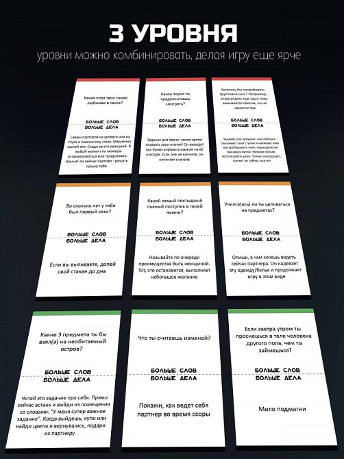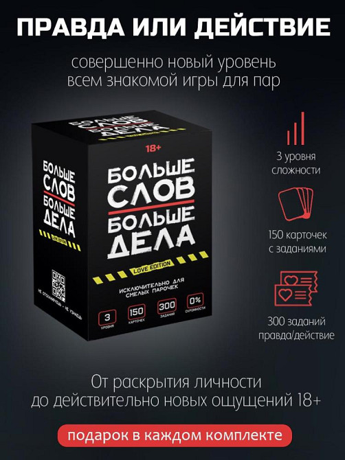 БОЛЬШЕ СЛОВ БОЛЬШЕ ДЕЛА - не просто очередная игра Правда или Действие. Вы получите игру для пар, в создании которой участвовали психологи и сексологи, с качественно проработанными заданиями, которые вы не встретите в других аналогичных играх. Здесь вы сможете не только весело провести время, но и узнать друг друга намного ближе, а также попробовать очень много нового в интимном плане.