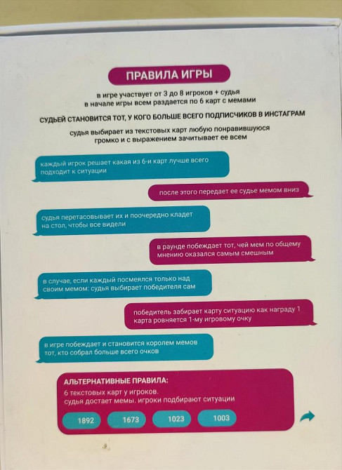 Настольная игра "ЧТО ЭТО ЗА МЕМ?" - лучший подарок для себя, для компании и для семьи. Она стала трендом в Америке, а теперь есть и на русском языке! Мемограм заставит вас истерически смеяться на любой тусовке с друзьями. Качественная и проработанная коробка мемов из плотных материалов и яркие картинки. Карты мемы два 2 ствола - самая горячая новинка для любого коллекционера монополий и настолок. Мемотрон имеет целых 150 карточек с мемами и 150 с разгонами. Мемология включает два способа игры, именно для этого мы сделали равнозначное количество карт. What Do you Meme для лиц старше 18-и лет, т.к. имеет карточки с нецензурной лексикой. Правила игры простые, побеждает тот, кто подбирает самые смешные мемы из своей колоды. Опиши это мемом либо подбери самую смешную ситуацию из колоды под общий мем. Memeclub - в наше время отдельная категория современного юмора. Праздничные игрушки от DROPSOLD вы полюбите после первой сыгранной партии и не спутаете ни с чем. Та самая игра из тик-ток