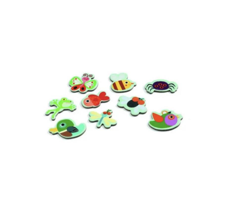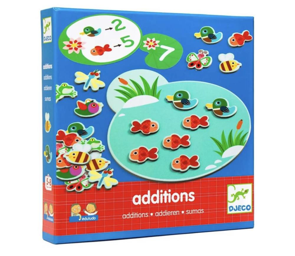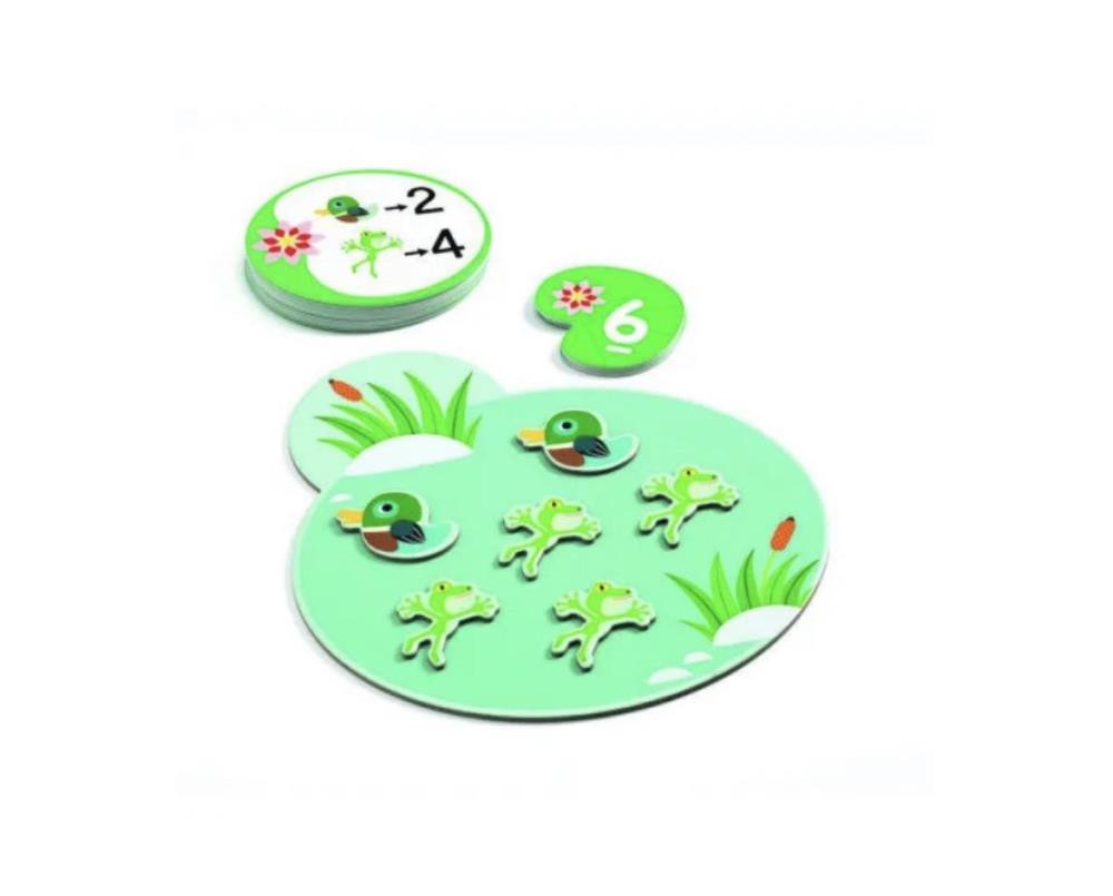 Игра Сложение из серии Eduludo от французского производителя Djeco основана на принципе "учись играя". С помощью этой игры ребенок в веселой игровой форме сможет научиться основам сложения чисел. В игру лучше играть ребенку с родителем. Игровое поле в виде пруда с камышами положите перед ребенком. Карточки с задачами и ответами положите возле игрового поля.Жетоны с животными разложите на столе. Ход игры: Ребенок вместе со взрослым смотрит карточку с задачей и пытается найти правильный ответ - сколько всего животных нужно разместить на игровом поле. Например: 2 стрекозы и 2 рыбки. Малыш должен взять указанных животных и пометить их на игровое поле, а затем сосчитать их общее количество и взять кувшинку с найденным числом. Взрослый наблюдает за действиями малыша и помогает найти правильный ответ. На обратной стороне карточек задача указан правильный ответ для того, чтобы малыш проверил и повторил решение.
