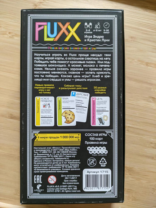 Fluxx – это карточная игра, в которой сыгранные карты сами определяют цель и задачи игры. Разыгрывая их различные свойства, вы можете изменить множество аспектов: как и сколько карт брать, как их разыгрывать и даже что, собственно, нужно сделать, чтобы победить?!