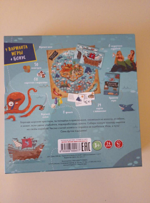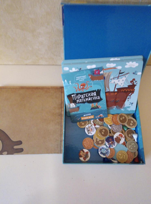 Продается настольная игра пиратская математика. Игра для всей семьи 3+. Развивает, мышление, учит считать и все это в атмосфере пиратских времен и баталий на кораблях. Цель игры собрать команду и раздобыть золотых монет. От 2 до 6 игроков. Продолжительность 15-45 мин.