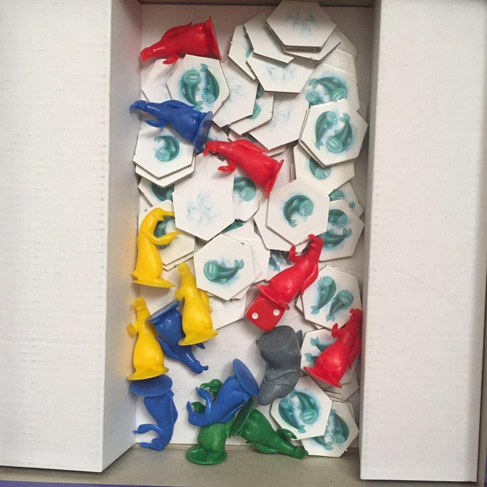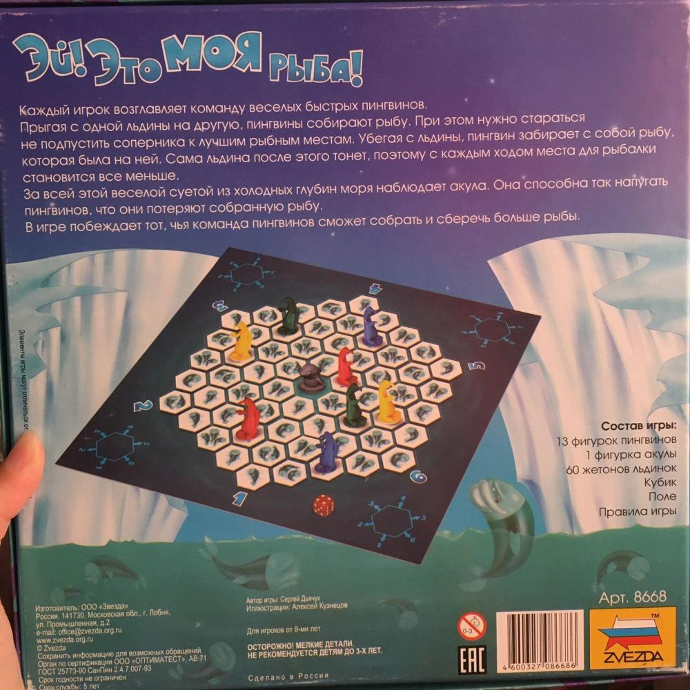 «Эй, это моя рыба!» — стратегия, доступная и детям, про пингвинов, прыгающих со льдины на льдину в охоте за рыбой и мешающих соперникам занять их рыбные места. В комплекте: игровое поле, инструкция (4 страницы), кубики, фишки. Количество игроков: 2-4. Возраст 8-99 лет.