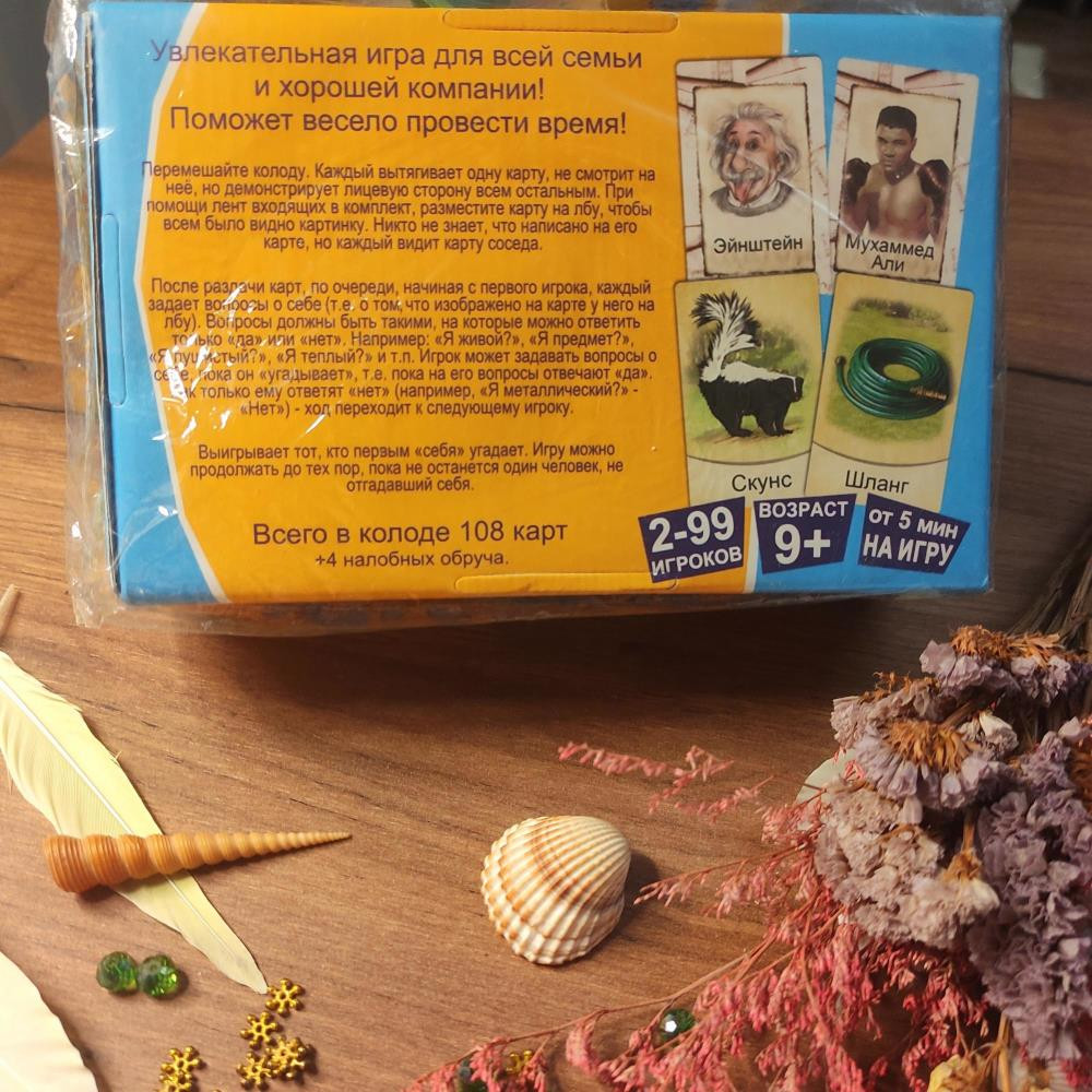 Каждый игрок вытягивает одну карту с колоды и не глядя размещает карточку у себя на лбу и угадывает, что на ней написано.