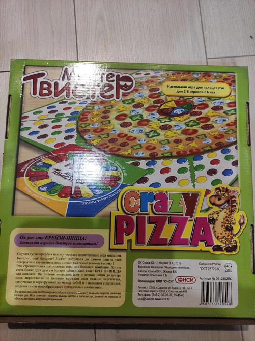 Настольная игра "Мистер Твистер" представляет собой особый вид популярной игры «Твистер» - пальчиковый. Игра Крейзи Пицца позволит весело провести время вам и вашим друзьям в любой ситуации. Игра содержит специальное поле с изображением аппетитной пиццы размером 60 на 60 сантиметров, вертушку, которая будет указывать ходы, и инструкцию. Размещая пальцы на красочных ингредиентах пиццы, вашей задачей будет добраться вдоль кусочка до середины пиццы.