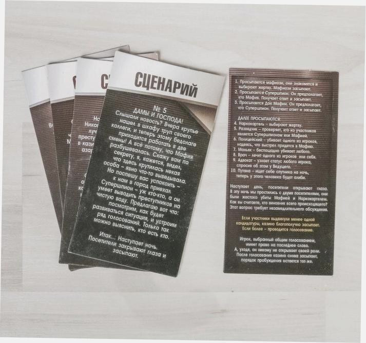 Игра «Мафия 007 с масками» точно не надоест вам и вашим близким, поскольку в наборе есть карточки с событиями и разные сценарии, которые вносят совершенно новые краски в ход игры. Уверяем, процесс вызовет море положительных эмоций!7
