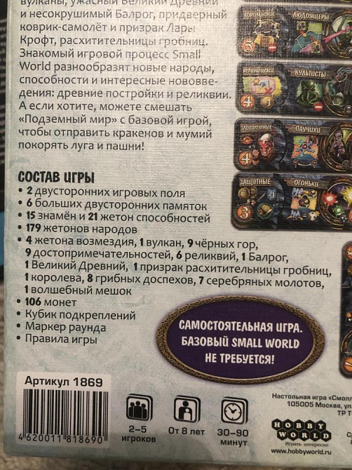 Настольная игра «Small World Поземный мир», полный комплект деталей, который был в игре изначально. Состояние: снаружи коробки есть потертости, а внутри все детали в отличном, первозданном состоянии см.фото. Играли всего несколько раз, продается в связи с неиспользованием. Больше аналогичных товаров у меня в профиле.