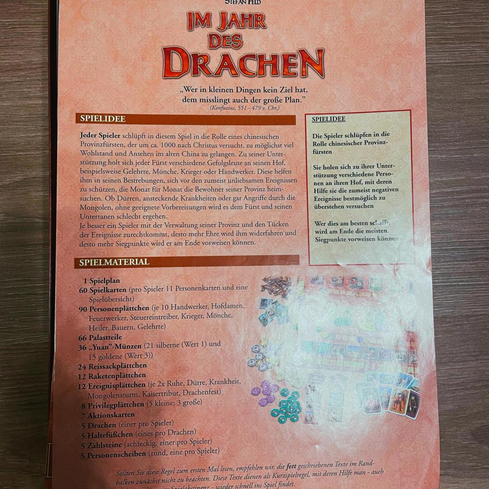 Настольная игра Год Дракона (немецкое название Im Jahr des Drachen, английское In the Year of the Dragon) придумана Стефаном Фелдом (Stefan Feld) и издана под маркой Alea (подразделение всем известной компании Ravensburger). Игра была опубликована в 2007 году и уже успела попасть в сотню лучших игр.